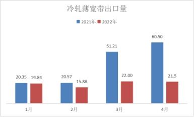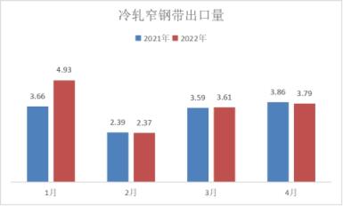 冷軋品種出口方面,4月份出口量同比下降,尤其以冷軋薄寬帶下降幅度最大,具體數據來看,冷軋薄板出口量為21.55萬噸,同比下降3.23%;冷軋薄寬帶出口量為21.5萬噸,同比下降64.46%,冷軋窄鋼帶出口量為3.79萬噸,同比下降1.81%。