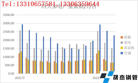 2022年4月份,冰箱產量652.4萬臺,同比下降15.8%;彩電產量1512.7萬臺,同比增長1.5%;洗衣機產量649.9萬臺,同比下降15.8%;空調產量2279.2萬臺,同比下降4.0%;