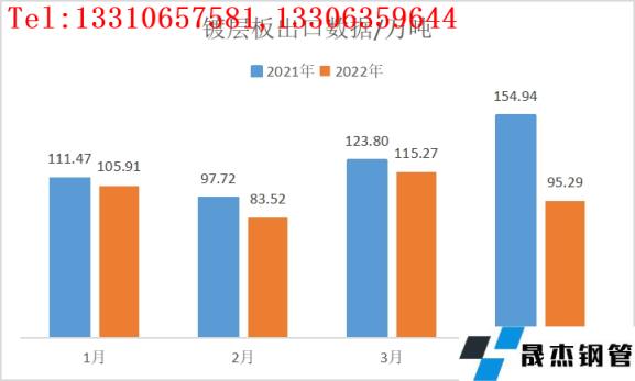 2022年4月我國鍍層板(帶)出口總量共計95.29萬噸,月環比降幅17.33%,年同比降幅38.50%;2022年1-4月份我國鍍層板(帶)出口總量共計399.99萬噸,年同比降幅18.02%。