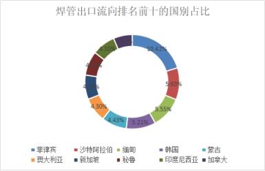 分地區(qū)來看,國內(nèi)厚壁鋼管出口市場主要集中在亞洲地區(qū),5月份在焊管出口量中占比小幅下降至59.05%;亞洲以外國別中美洲出口量占比小幅下降至16.42%。從國別來看,我國焊管的主要流向地區(qū)依次為菲律賓、沙特阿拉伯、緬甸、韓國、蒙古、澳大利亞、新加坡、秘魯、印度尼西亞、加拿大。較上月相比,菲律賓繼續(xù)排名首位;沙特阿拉伯增長79.50%,蒙古增長56.45%,加拿大增長72.87,相繼進(jìn)入排名前十,智利下降67.09%跌出排名前十。從出口量排名前十的國別數(shù)量來看,亞洲占70%,美洲占20%,澳洲占10%。