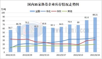 截止2022年6月24日,據(jù)云商平臺監(jiān)測數(shù)據(jù)顯示,國內(nèi)熱軋卷板社會庫存量約為264.53萬噸,環(huán)比增加20.82萬噸。重點城市庫存整體表現(xiàn)不一,華東區(qū)域受上海復(fù)工復(fù)產(chǎn)影響小幅消庫為主,華北、華南庫存持續(xù)累庫。具體來看,廣州地區(qū)熱卷社會庫存量約為71.00萬噸,環(huán)比增加9.09萬噸;上海熱卷社會庫存量環(huán)比下降4.84萬噸至37.00萬噸;天津熱卷社會庫存量約為8.00萬噸,環(huán)比增加0.80萬噸。
