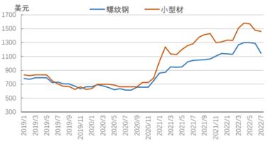 美國長材價格漲跌互現。7月底,美國中西部無縫鋼管廠家螺紋鋼價格下跌140美元至1150美元,進口螺紋鋼價格下跌35美元至1040美元;中西部無縫鋼管廠家小型材價格下跌15美元至1460美元,進口小型材價格下跌50美元至1310美元。美聯儲持續收緊貨幣政策,高利率抑制買家需求,美國房地產市場快速降溫,將對厚壁鋼管需求形成負面影響,美國長材市場價格處于高位,仍有回調空間,8月份北美市場長材價格或延續震蕩調整的走勢。