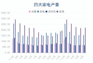 1-6月份,冰箱產量4164.2萬臺,同比下降6.2%;彩電產量8986.4萬臺,同比增長5.8%;洗衣機產量4113.3萬臺,同比下降4.1%;空調產量12248.9萬臺,同比增長1.1%。