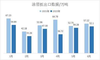 2022年6月我國鍍層板(帶)出口總量共計124.86萬噸,月環比降幅5.82%,年同比降幅20.33%;2022年上半年我國鍍層板(帶)出口總量共計657.43萬噸,年同比降幅15.98%。